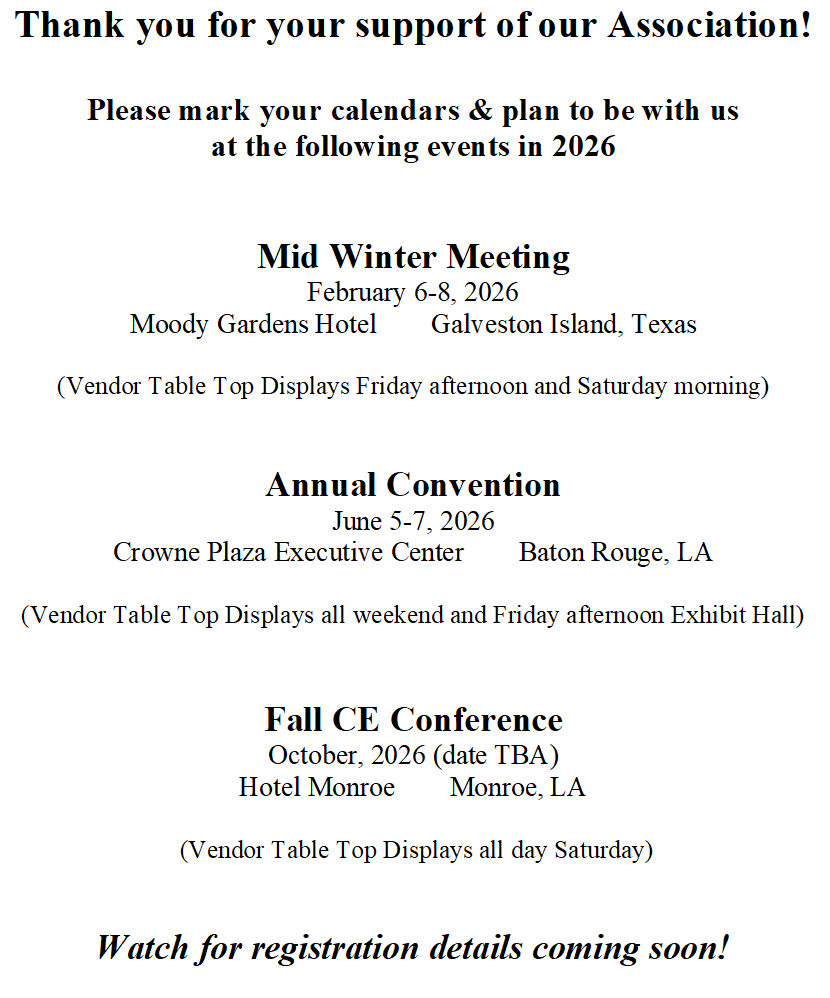 Annual Convention: every June, held in Baton Rouge, LA, from Friday-Sunday; 16+ hours of CE for Optometrists, 12+ hours of CE for staff members; Friday Exhibit Hall + weekend display tables; Technology Symposium; 2 OD Luncheons; Saturday Night Dinner & Social.